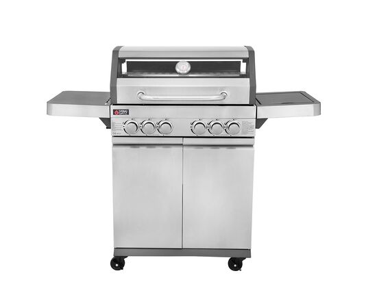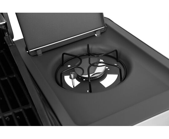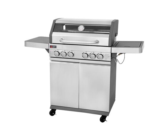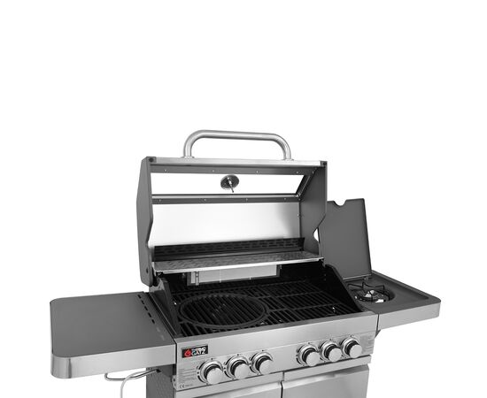 4 καυστήρες INOX 3kW ο καθένας 1 καυστήρας οπίσθιος κεραμικός infrared BACKBURNER 3,5kW 1 πλαϊνή εστία INOX 2,5kW Σχάρες μαντεμένιες εμαγιέ ματ MULTIFUNCTIONAL Σχάρα συντήρησης INOX 67,7x12εκ. Θάλαμος ψησίματος επισμαλτωμένος (εμαγιέ) Καπάκι διπλού τοιχώματος με ανοξείδωτη χειρολαβή και γυάλινο μέρος Αποσπώμενο συρτάρι συλλογής λίπους Αυτόματη ανάφλεξη Εμαγιέ διαχύτες Θερμόμετρο INOX Αναδιπλούμενο αριστερό ράφι Διακόπτες με μαύρο δακτύλιο και INOX βάση Συμπαγείς ρόδες μεταφοράς με φρένο Χώρος αποθήκευσης Επιφάνεια ψησίματος: 70x42εκ. Διαστάσεις Συσκευασίας: (ΜxΥxΒ) 77x55,5x53εκ.