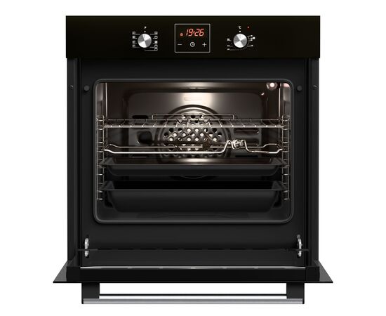 Φούρνος Άνω πάγκου 8 Τρόποι Ψησίματος Υδρόλυση Ψηφιακό χρονόμετρο Ενεργειακή κλάση Α TURBO fan Πλευρικές ράγες χρωμίου Σούβλα Απόψυξη Χειρολαβή αλουμινίου Πόρτα με ΤΡΙΠΛΟ κρύσταλλο, αποσπώμενο Πάνελ: Μαύρο Γυαλί Λυχνία Ανεμιστήρας φούρνου