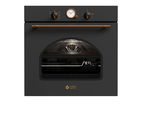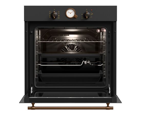 Φούρνος Άνω πάγκου 80 λίτρων Ενεργειακή κλάση Α 8 τρόποι ψησίματος TURBO fan με αντίσταση Σούβλα Υδρόλυση Πλευρικές ράγες χρωμίου Λυχνία φούρνου Αποσπώμενο τριπλό κρύσταλλο Πάνελ: Ανθρακί Rustic Rustic χειρολαβή Rustic διακόπτες Rustic αναλογικό χρονόμετρο Ανεμιστήρας περιφερειακής ψύξης Ανεμιστήρας ψύξης