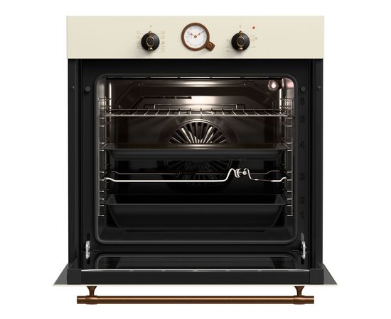 Φούρνος Άνω πάγκου 80 λίτρων Ενεργειακή κλάση Α 8 τρόποι ψησίματος TURBO fan με αντίσταση Σούβλα Υδρόλυση Πλευρικές ράγες χρωμίου Λυχνία φούρνου Αποσπώμενο τριπλό κρύσταλλο Πάνελ: Μπεζ Rustic Rustic χειρολαβή Rustic διακόπτες Rustic αναλογικό χρονόμετρο Ανεμιστήρας περιφερειακής ψύξης Ανεμιστήρας ψύξης