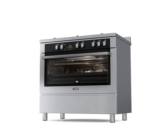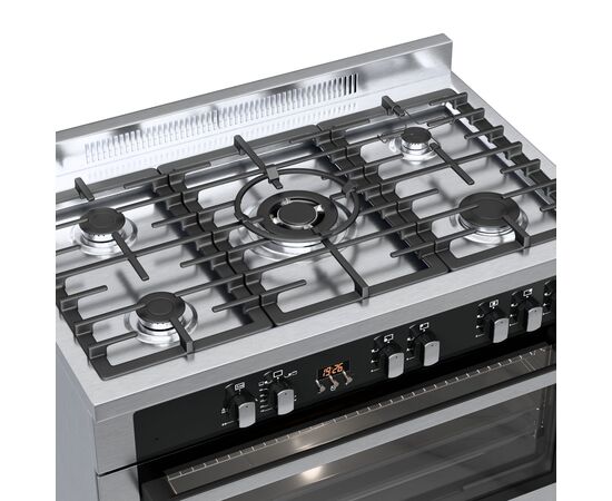 Κουζίνα αερίου Ημι-επαγγελματική Υγραέριο LPG G30 / G31 Φυσικό αέριο NG G20 Φούρνος 89lt (net) με Θερμοστάτη 8 τρόποι ψησίματος 5 εστίες (1 WOK) Καυστήρες SABAF Σχάρες εστιών μαντεμένιες Αυτόματη ανάφλεξη Θερμικά ασφαλείας Double Turbo Fan Πλαϊνές σχάρες στο φούρνο Τηλεσκοπικές Ράγες Σούβλα Πόρτα με διπλό κρύσταλλο αποσπώμενο Θερμόμετρο στο τζάμι του φούρνου Ψηφιακός προγραμματιστής 3 πλήκτρων Ανεμιστήρας ψύξης Γυάλινο Πάνελ Λειτουργιών INOX Splashback Αποθηκευτικός χώρος με ανακλινόμενο πορτάκι Ενεργειακή κλάση Α Πιστοποίηση CE Μεταλλικά τηλεσκοπικά πόδια Σώμα: Full INOX