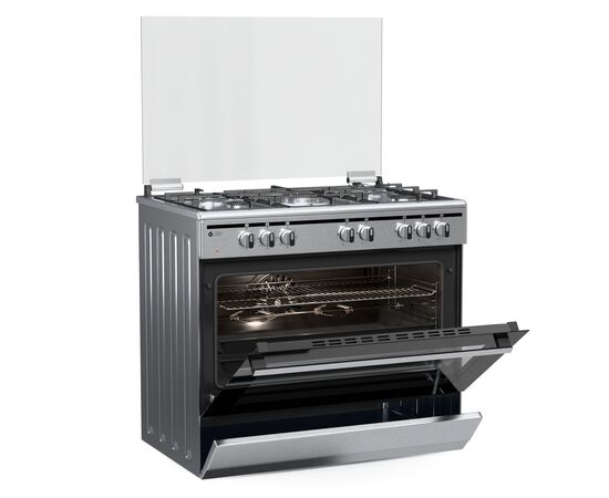 Κουζίνα μικτή Φούρνος ηλεκτρικός και 5 εστίες αερίου Υγραέριο LPG G30 / G31 - Φυσικό αέριο NG G20 8 τρόποι ψησίματος Απόψυξη Ενεργειακή κλάση Α Χρώμα Inox Αυτόματη ανάφλεξη Θερμικά ασφαλείας Γυάλινο καπάκι Πόρτα με διπλό κρύσταλλο αποσπώμενο Χειρολαβή αλουμινίου Χρονοδιακόπτης μηχανικός Ράγες χρωμίου Γκριλ Σχάρες εστιών μαντεμένιες Διασπορείς εμαγιέ ματ Σούβλα Ανεμιστήρας στον φούρνο Αποθηκευτικός χώρος με ανακλινόμενο πορτάκι