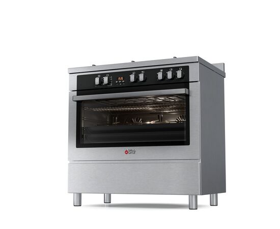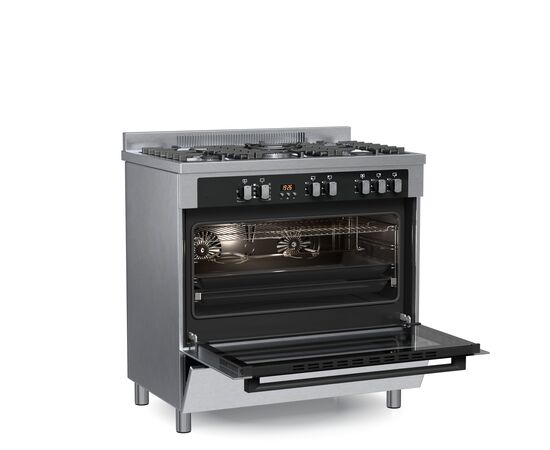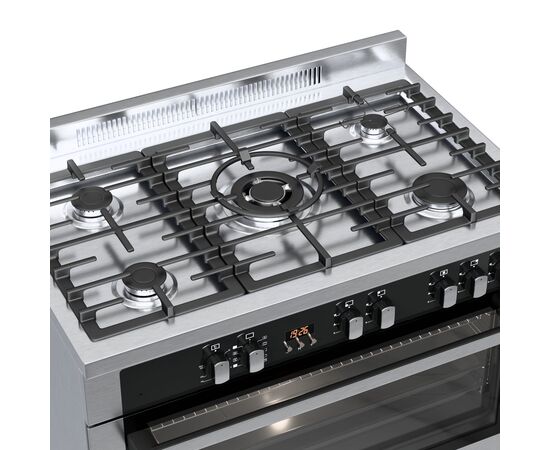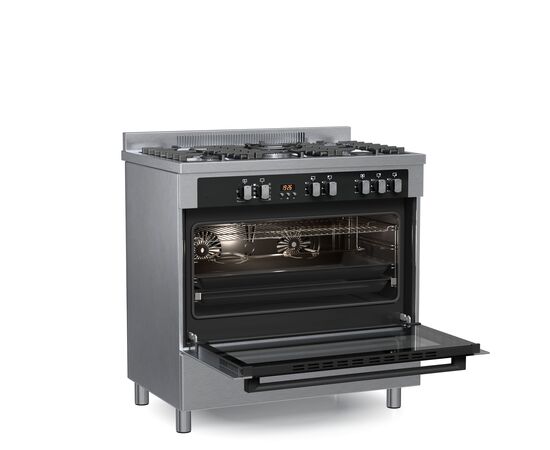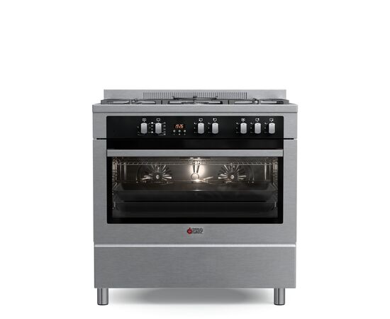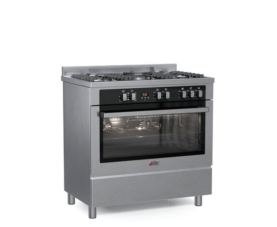 Κουζίνα Μικτή Ημι-επαγγελματική Υγραέριο LPG G30 / G31 Φυσικό αέριο NG G20 Φούρνος Ηλεκτρικός 98lt (net) με Θερμοστάτη 7 τρόποι ψησίματος 5 εστίες (1 WOK) Καυστήρες SABAF Σχάρες εστιών μαντεμένιες Αυτόματη ανάφλεξη Θερμικά ασφαλείας Double Turbo Fan (3 Spiral) Αποθηκευτικός χώρος με ανακλινόμενο πορτάκι Ενεργειακή κλάση Α Ψηφιακός προγραμματιστής 3 πλήκτρων Ανεμιστήρας ψύξης Πλαϊνές σχάρες στο φούρνο Τηλεσκοπικές Ράγες Μεταλλικά τηλεσκοπικά πόδια Σούβλα Splashback Πόρτα με διπλό κρύσταλλο αποσπώμενο Θερμόμετρο στο τζάμι του φούρνου Γυάλινο Πάνελ Λειτουργιών Πιστοποίηση CE Σώμα: Full INOX